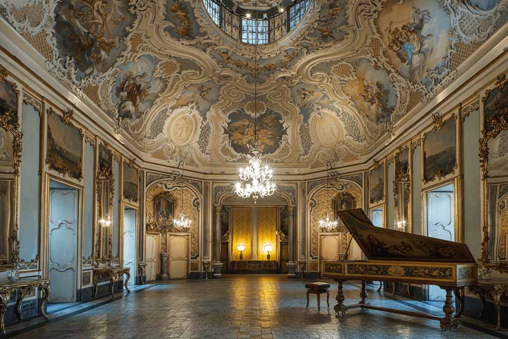 The facade is a perfect example of Baroque elegance, characterized by sinuous lines and a series of ornamental balconies that enrich its appearance. The interior of the palace is equally stunning, with sumptuous rooms adorned with stuccoes, frescoes, fine marbles, and antique furniture. Among the most fascinating features are the magnificent decorations of the Grand Hall of Orchestra and the grand staircase.